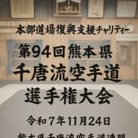 令和7年8月10日、全日本大会終了直後に発生した大雨により、本部道場が床上浸水の被害を受けました。 その復興を祈念し、令和7年11月24日、玉名市総合体育館にて「第94回 熊本県千唐流空手道・本部道場復興チャリテ …